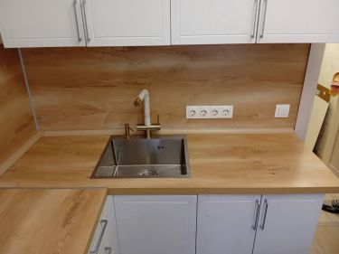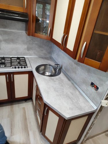 Подгоним под размер, сделаем выпилы под коммуникации и установим столешницу. Наклеим кромки. Работа займёт 2–4 часа. Будет шумно.