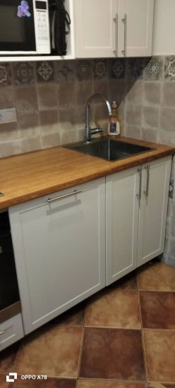 Снимем старые дверцы. Вырежем отверстия под петли, сделаем разметку и прикрепим ручки. Навесим и отрегулируем новые дверцы. Работа займёт 30–60 мин. Будет шумно.